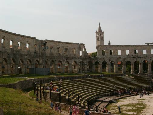 Es war ein schönes Land und wir erreichten Pula wo uns die Kroatische Reiseleiterin das zweitgrösste Amphitheater (nach dem Kolosseum in Roma) der Welt zeigte. Die 2000 Jahre alte Arena, wird heute für Theater, Shows, Staatsauftritte und Openair-Kinos verwenden. Es wird gut Besucht. Die Stadt selber ist eine riesige Archälogische Grabung immer wieder finden Archälogen Römische Gebäuderesten. Auch unterhalb des Hauptplatzes neben dem Rathaus der aufgerissen ist. Pula liegt an der Südspitze von Istrien.